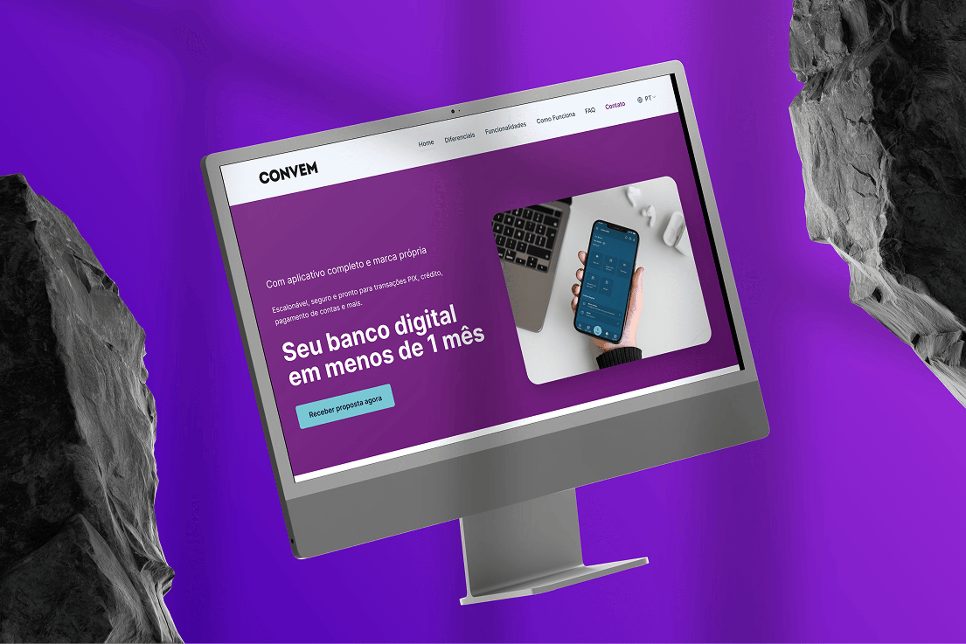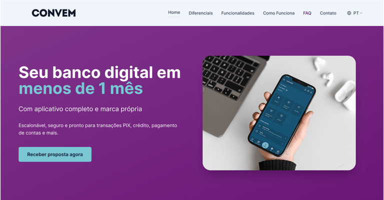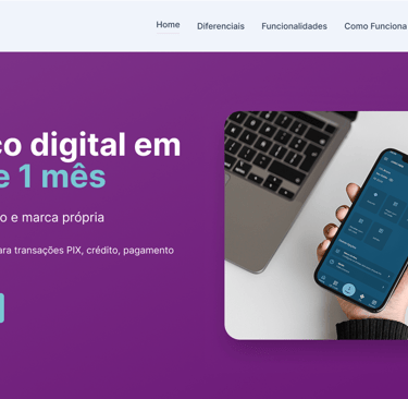 Foi possível trazer uma comunicação mais clara e moderna, reforçando a identidade da marca e o foco em conversão. A nova versão apresenta uma headline mais objetiva (“Seu banco digital em menos de 1 mês”), cores vibrantes que transmitem inovação e confiança, além de um layout mais estruturado e CTA mais visível, incentivando a ação do usuário. A navegação foi reorganizada para destacar diferenciais e funcionalidades, resultando em uma página mais atrativa, profissional e alinhada ao posicionamento de uma fintech moderna.